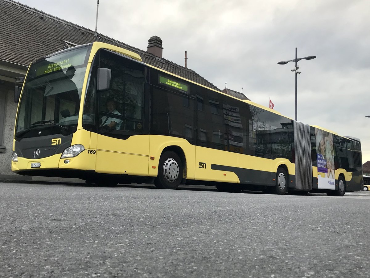 Der STI C2 Gelenkbus 169 am 26.4.18 nach der Ankunft beim Bhf Thun,