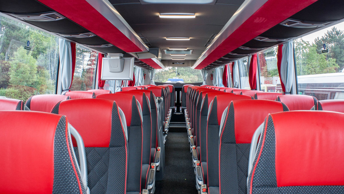 Der Innenraum vom neuen Mercedes-Benz Tourismo von Birgels Reisen. Sehr elegant. Vor allem die Farbkombination. | August 2018