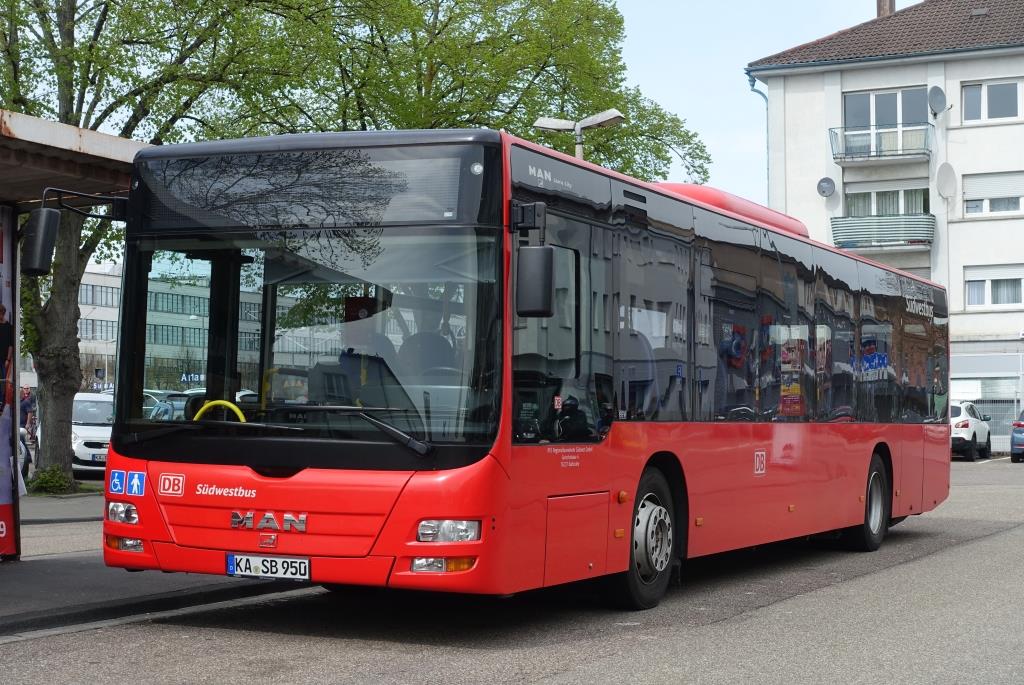 Hier ist der KA SB 635 der Südwestbus auf der Buslinie 125 nach Kirrlach über Bruchsal unterwegs. Gesichtet am Fächerbad in Karlsruhe am 11.05.2018.