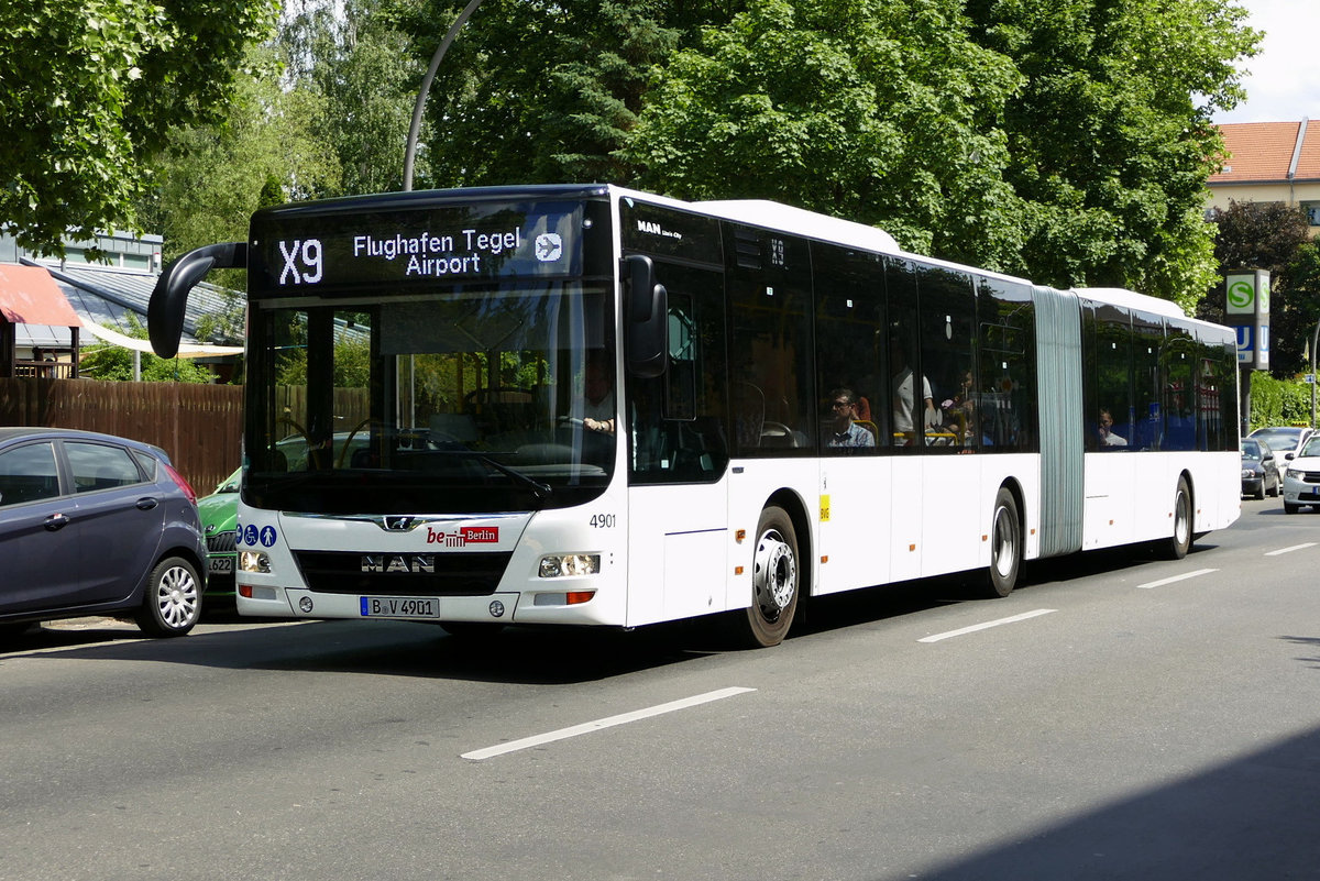 Neu bei der BVG die MAN Lion's City GN, hier Wagen '4901', als X9 unterwegs Richtung Flughafen Berlin -Tegel im Mai 2018.