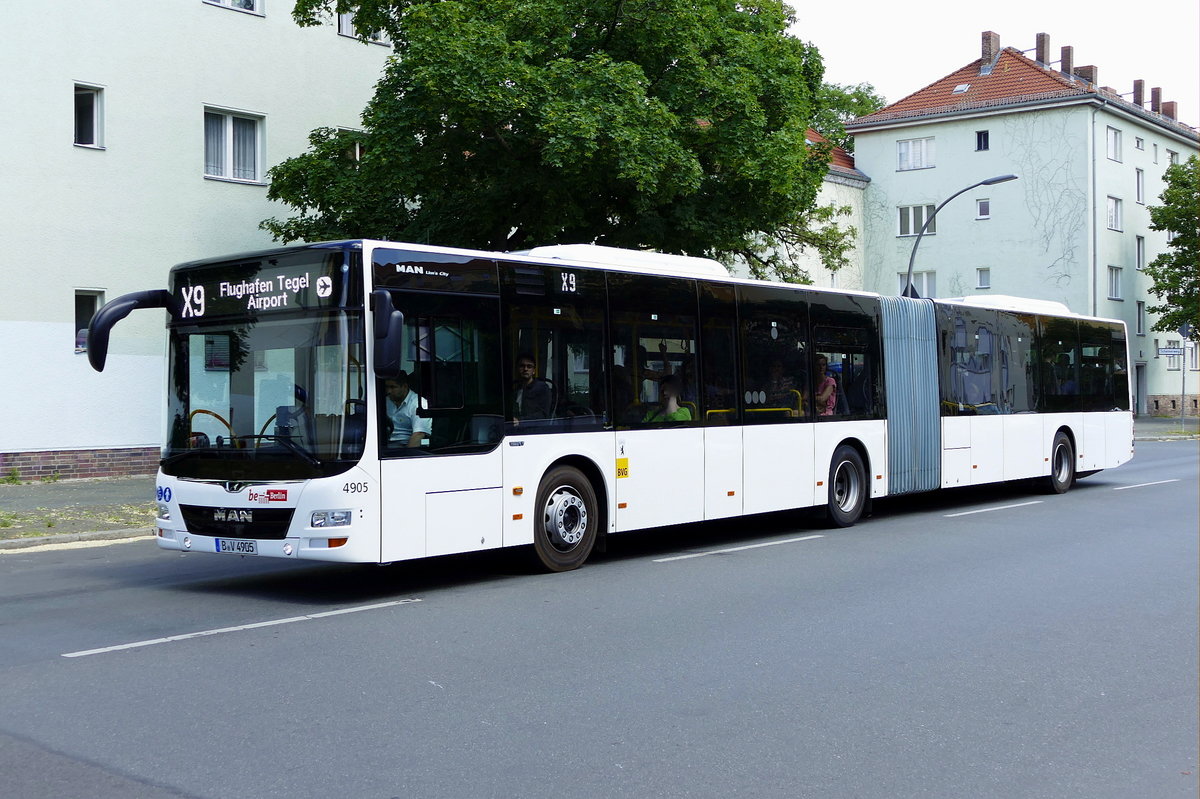 Neu bei der BVG, die MAN Lion's City GN, hier Wagen '4905' als X9 unterwegs Richtung Flughafen Berlin -Tegel im Mai 2018.