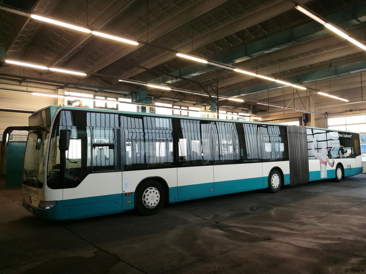 Ein Mercedes Benz O530G der neusten Generation von der SWK (Stadtwerke Krefeld) mit der Wagennummer 5696 (WKR-Werbung) am Krefelder Hauptbahnhof (Süd). | September 2018