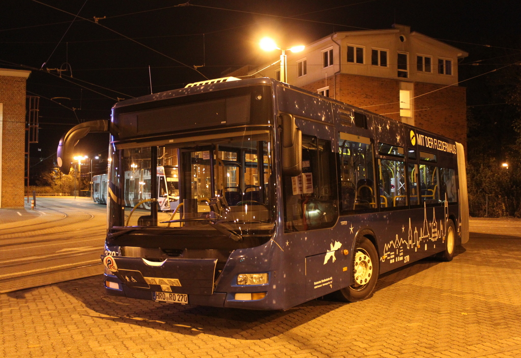 Am Abend des 30.10.2018 stand der MAN Niederflurbus der 3. Generation (Lion's City) Wagen 270 der Rostocker Straßenbahn AG auf dem Gelände der Rostocker Straßenbahn AG.