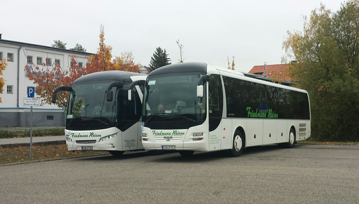 Hier warten der SÜW P 513 und der SÜW P 524 von Friedmann Reisen auf ihren nächsten Einsatz. Gesichtet am Bahnhof Bad Bergzabern am 29.10.2018