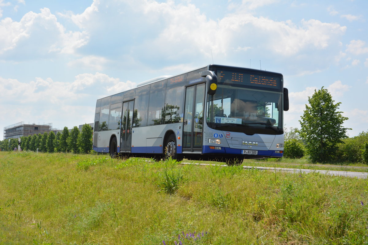 Am 04.06.2016 fährt P-AV 585 für die ILA 2016 auf der Shuttle Linie "L". Aufgenommen wurde ein MAN Lion's City der BVSG / Betriebshof Stahnsdorf.