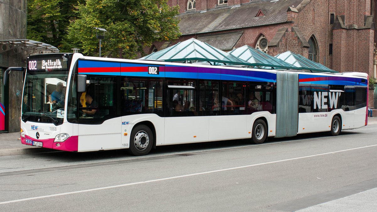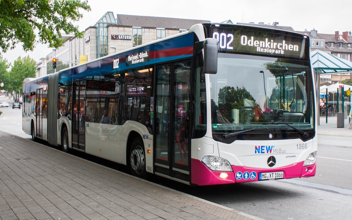 Das Neueste vom Neuen besitzt nun auch die NEW' Möbus. Dieser MB O530G der neusten Generation mit der Wagennummer 1866 konnte am Marienplatz in Mönchengladbach Rheydt aufgenommen werden. | August 2018