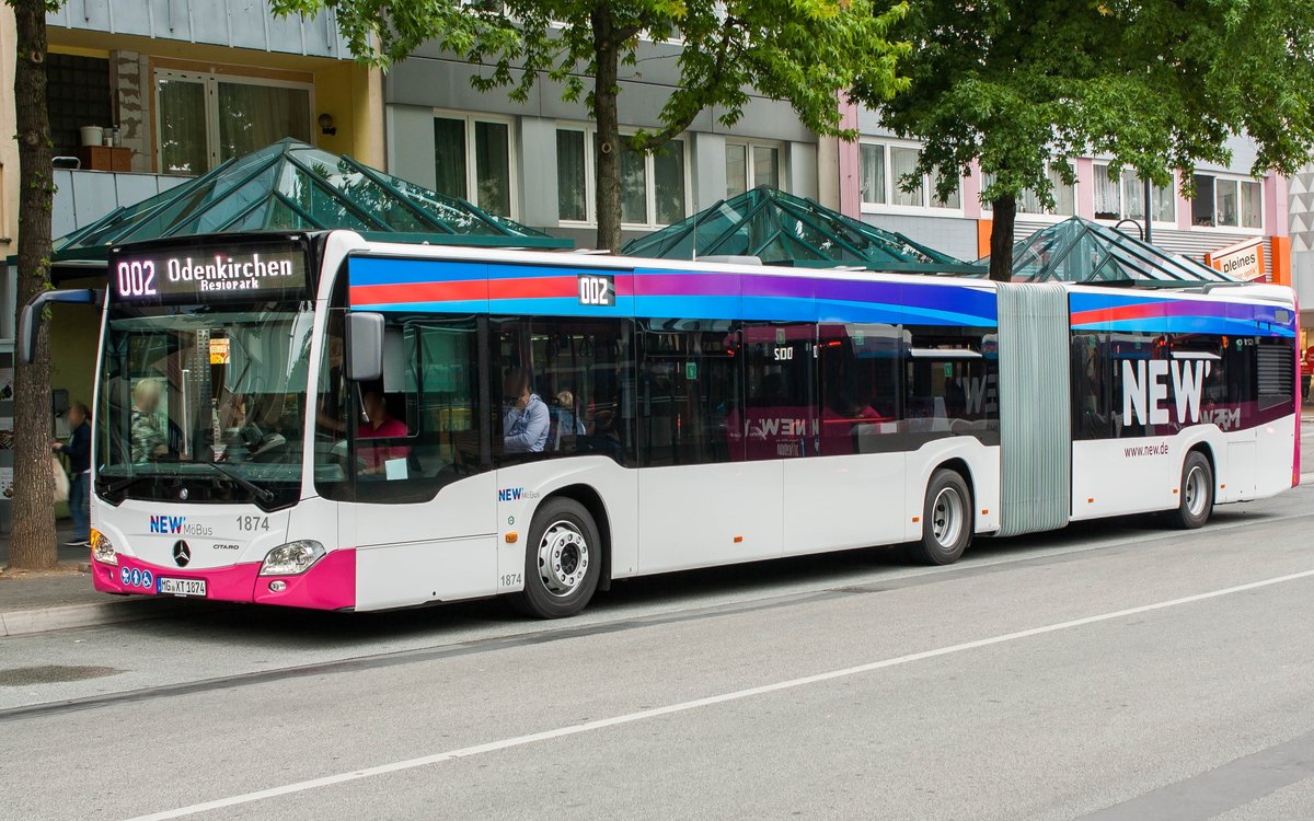 Das Neueste vom Neuen besitzt nun auch die NEW' Möbus. Dieser MB O530G der neusten Generation mit der Wagennummer 1874 konnte am Marienplatz in Mönchengladbach Rheydt aufgenommen werden. | August 2018