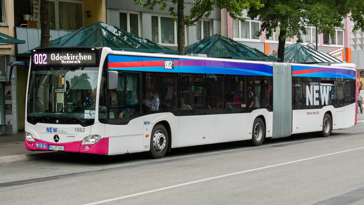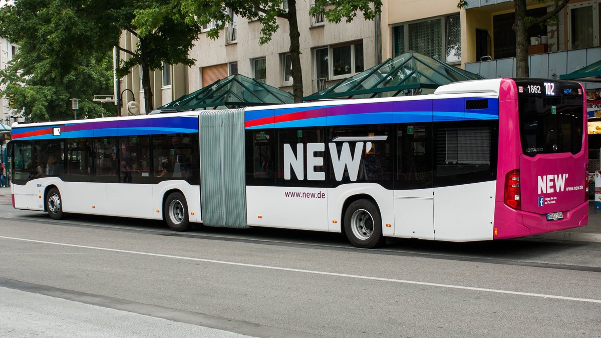 Das Neueste vom Neuen besitzt nun auch die NEW' Möbus. Dieser MB O530G der neusten Generation mit der Wagennummer 1862 konnte am Marienplatz in Mönchengladbach Rheydt aufgenommen werden. | August 2018