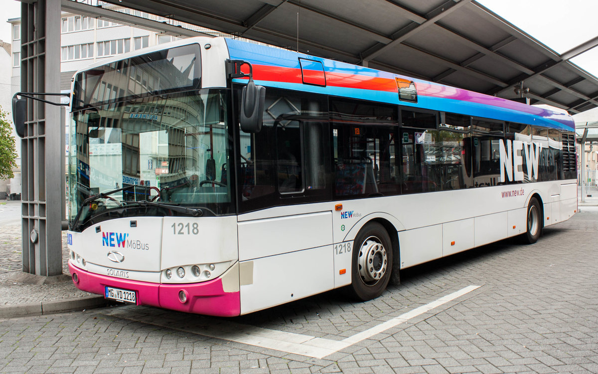 Ein Solaris Urbino 12 von der NEW'MöBus mit der Wagennummer 1218 am Mönchengladbacher Hauptbahnhof. Auch interessant ist der kleine Schönheitsfleck. | August 2018