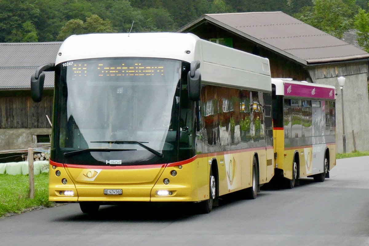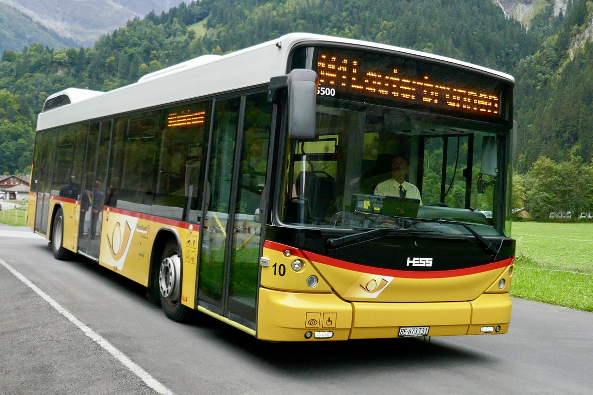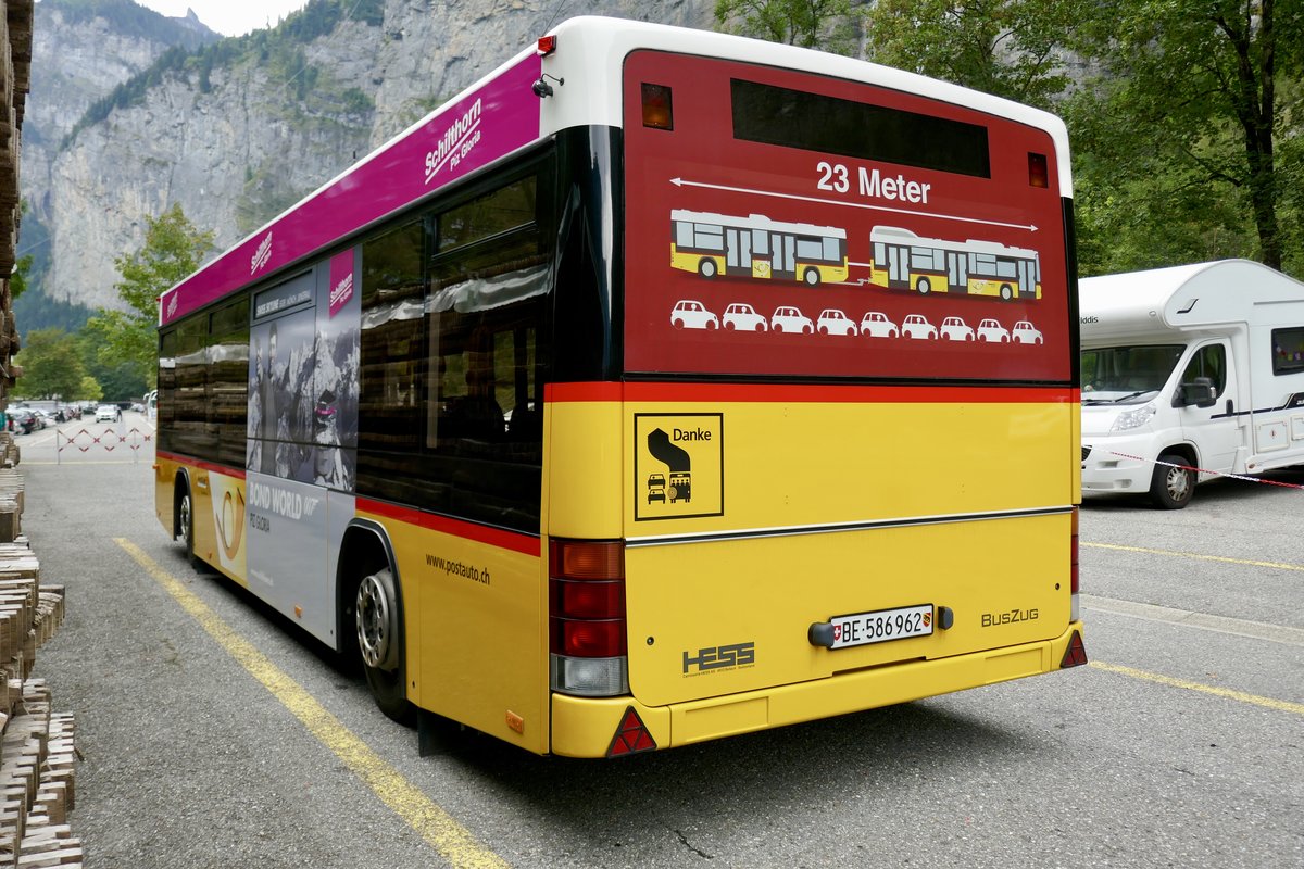 HESS Bus(zug) aus der Region Laupen der in Lauterbrunnen aushilft, am 16.9.18 bei der Einfahrt zum Parkplatz der Schilthornbahn.