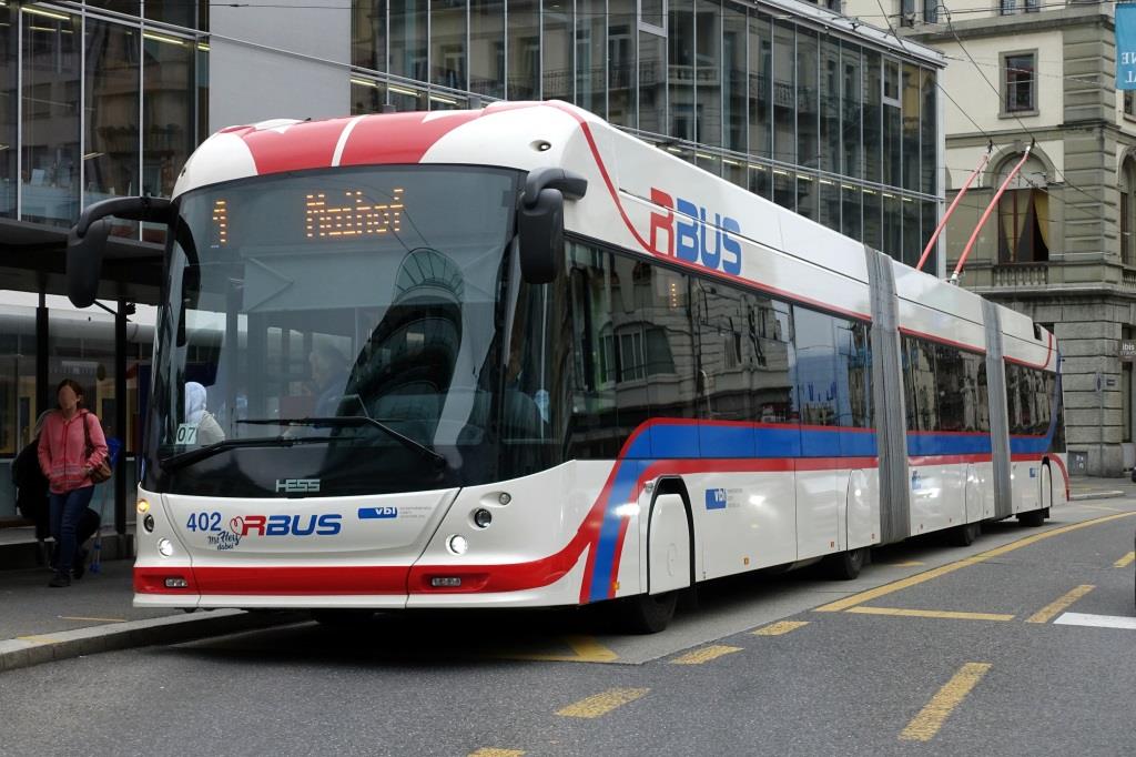 tpf Nr. 527 (Hess Swisstrolley 3 BGT-N2C) am 28.7.2018 beim Bhf. Fribourg