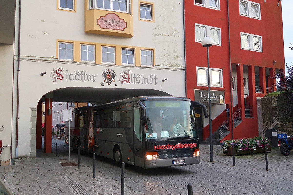 Setra S319L von Wechselberger KU-WEX 15 als Schienenersatzverkehr für DB Fernverkehr in Kufstein, Unterer Stadtplatz/Stadttor. Aufgenommen 7.8.2018.