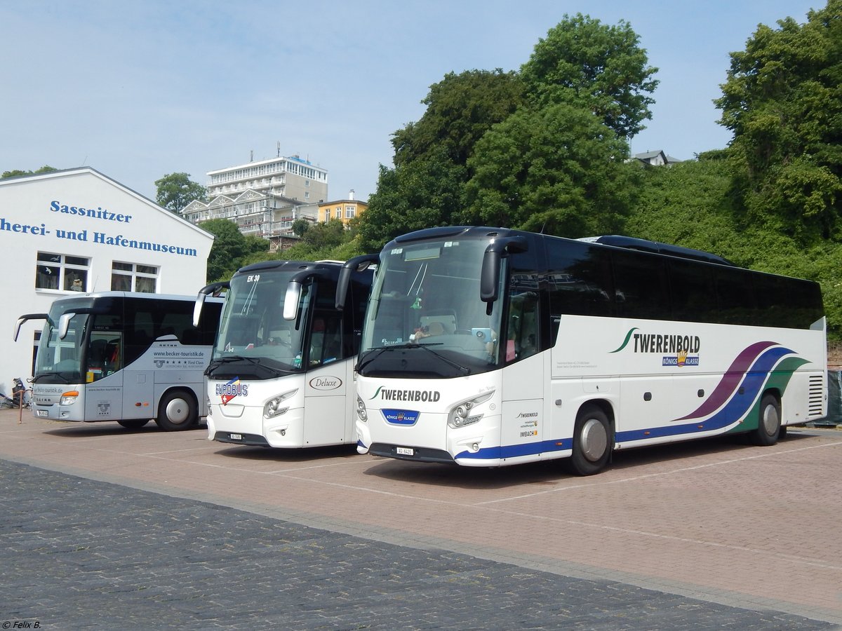 Setra 415 GT-HD von Becker Touristikaus Deutschland und VDL Futura von Eurobus und VDL Futura von Twerenbold aus der Schweiz im Stadthafen Sassnitz. 2016