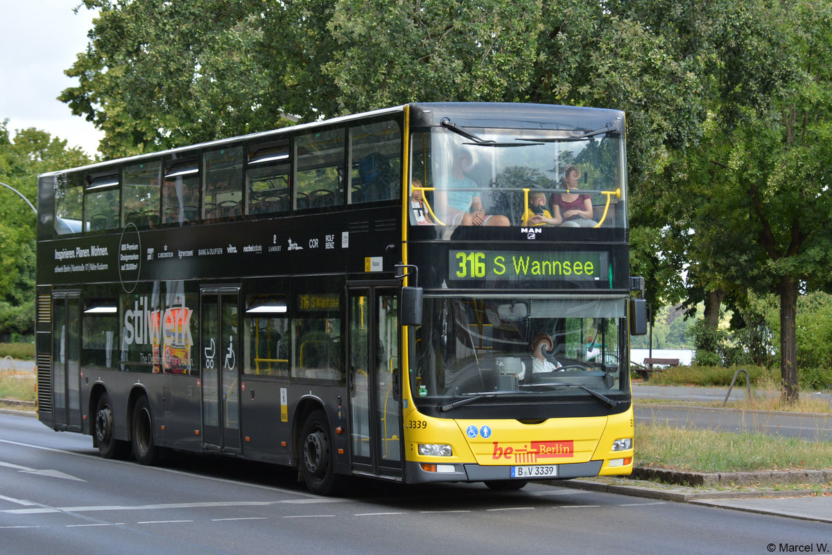 Am 05.08.2018 fuhr B-V 3339 auf der Linie 316. Aufgenommen wurde ein MAN Lion's City DD / Berlin Wannsee.