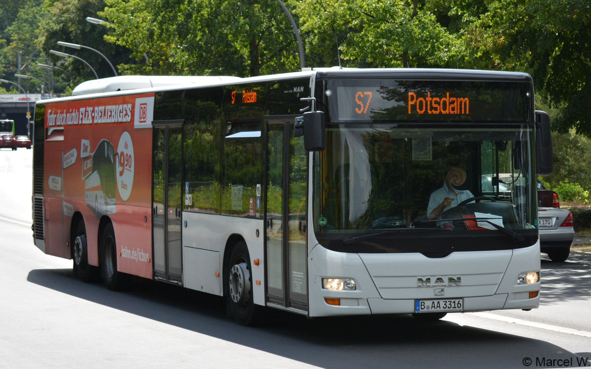 B-AA 3316 ist am 05.08.2018 für die S-Bahn Berlin GmbH als SEV unterwegs. Aufgenommen wurde ein MAN Lion's City / Bahnhof Wannsee.