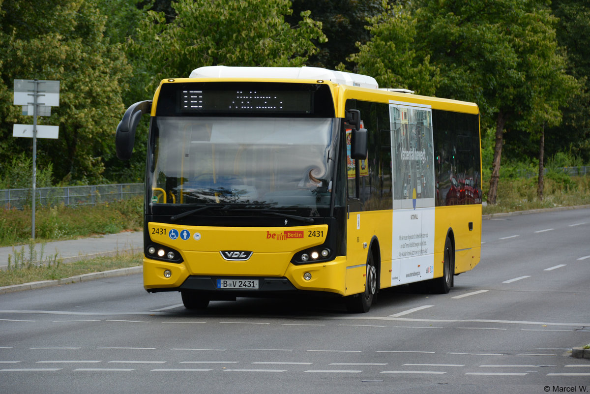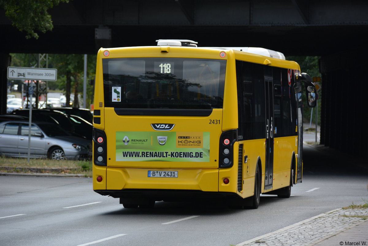 B-V 2431 fuhr am 05.08.2018 auf der Linie 118. Aufgenommen wurde ein VDL Citea / Berlin Wannsee.