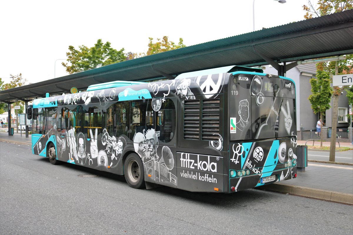 ICB Solaris Urbino 12 Wagen 119 mit Fritz Kola Werbung am 11.08.19 in Frankfurt Enkheim