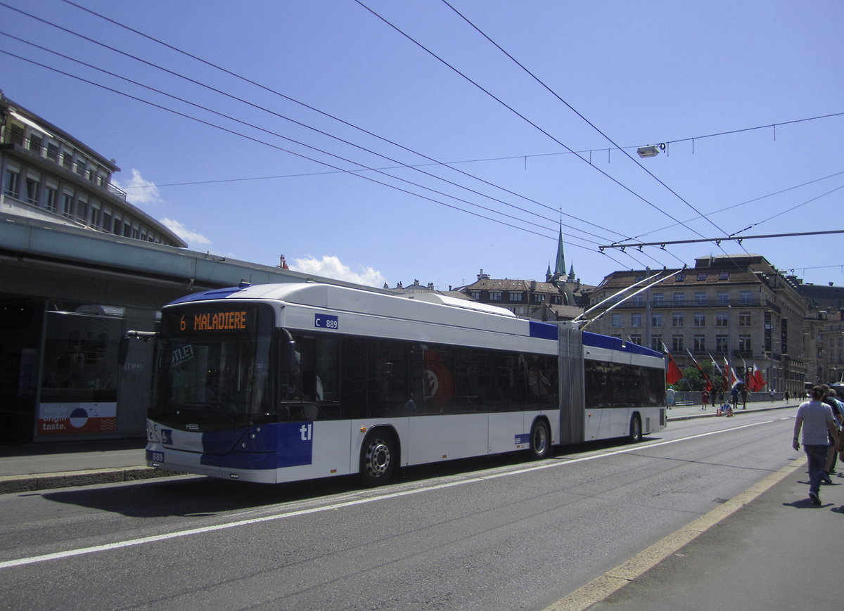 tl Nr. 889 (Hess Swisstrolley 4 BGT-N2D) am 30.7.2019 auf der Grand-Pont zwischen den Haltestellen St-François und Bel-Air