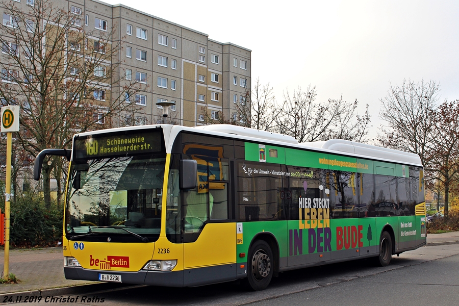 BVG Wagen 2236 auf Linie 160 nach Schöneweide Hasselwerderstraße - Berlin, Siriusstraße - am 24.11.2019 - Werbung: Wohnungsbaugenossenschaften/Wohnungsbaugenossenschaft Amtsfeld