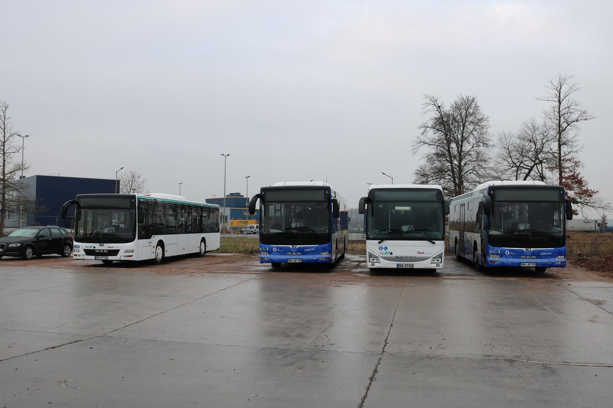 Vier RackTours MAN Lions City und ein Setra Überlandbus am 31.12.18 in Erlensee auf dem ehemaligen Fliegerhorst der US Army. Dort stehen viel Busse von RackTours und BRHVias Bus. Ich durfte durch Nachfrage eines Mitarbeiters Fotos machen