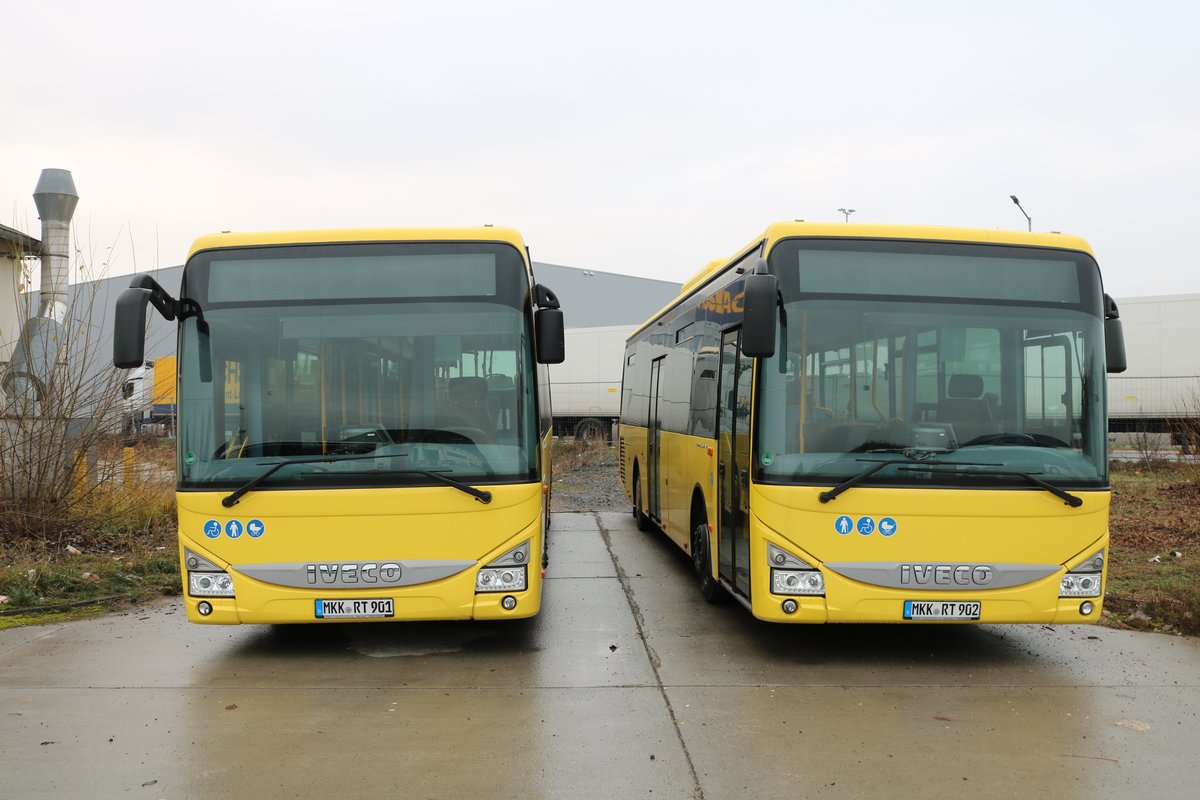 Zwei RackTours IVECO Crossway am 31.12.18 in Erlensee auf dem ehemaligen Fliegerhorst der US Army. Dort stehen viel Busse von RackTours und BRHVias Bus. Ich durfte durch Nachfrage eines Mitarbeiters Fotos machen