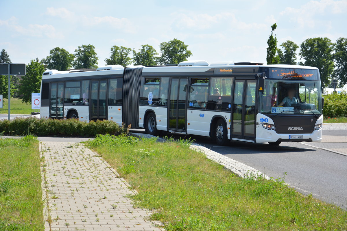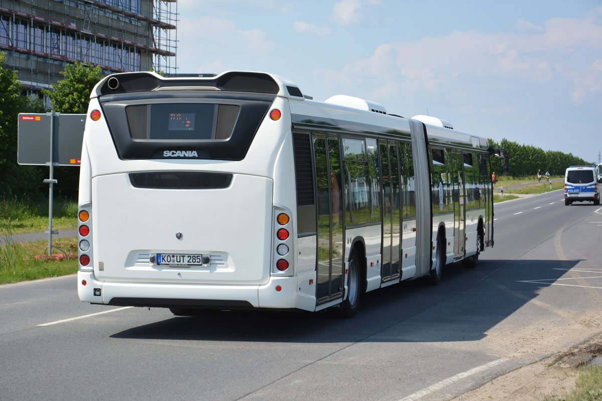 Am 04.06.2016 fährt KO-UT 285 für die ILA 2016 auf der Sonderlinie S zwischen Bahnhof Schönefeld und ILA-Gelände. Aufgenommen wurde ein Scania Citywide.