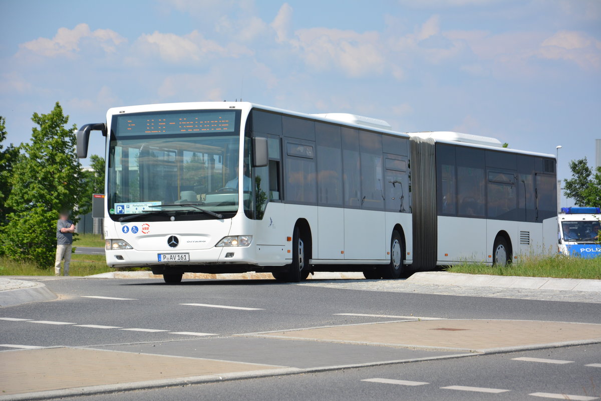 Am 04.06.2016 fährt P-AV 161 für die ILA 2016 auf der ILA Sonderlinie P3 zwischen Parkplatz P3 und ILA-Gelände. Aufgenommen wurde ein Mercedes Benz Citaro I Facelift G der BVSG (Betriebshof Potsdam).