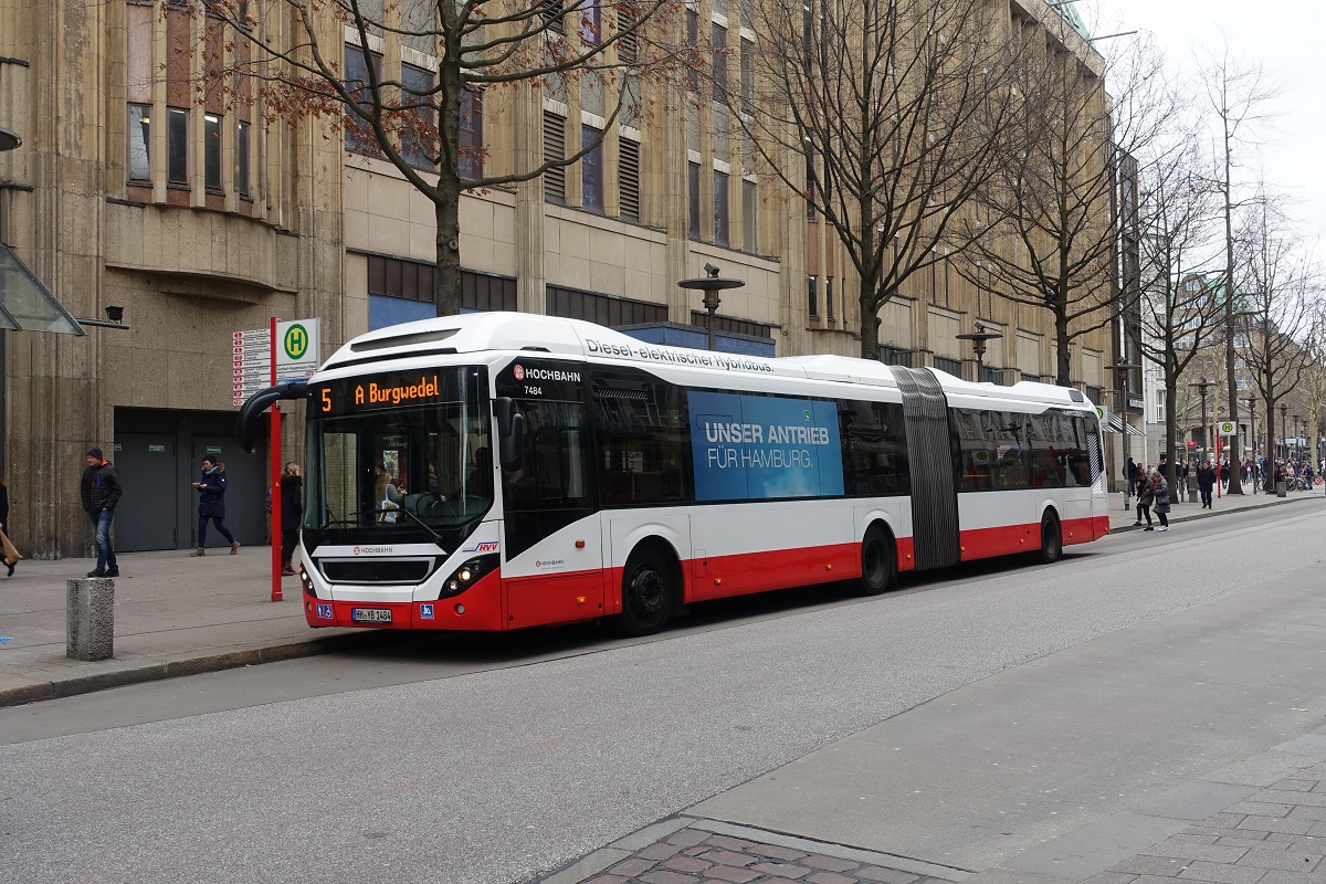 HHA 7484 (HH-YB 1484), am 1.3.2019, Hamburg, Mönckebergstr., Linie 5 nach Burgwedel, Volvo 7900 LH, EZ 2014