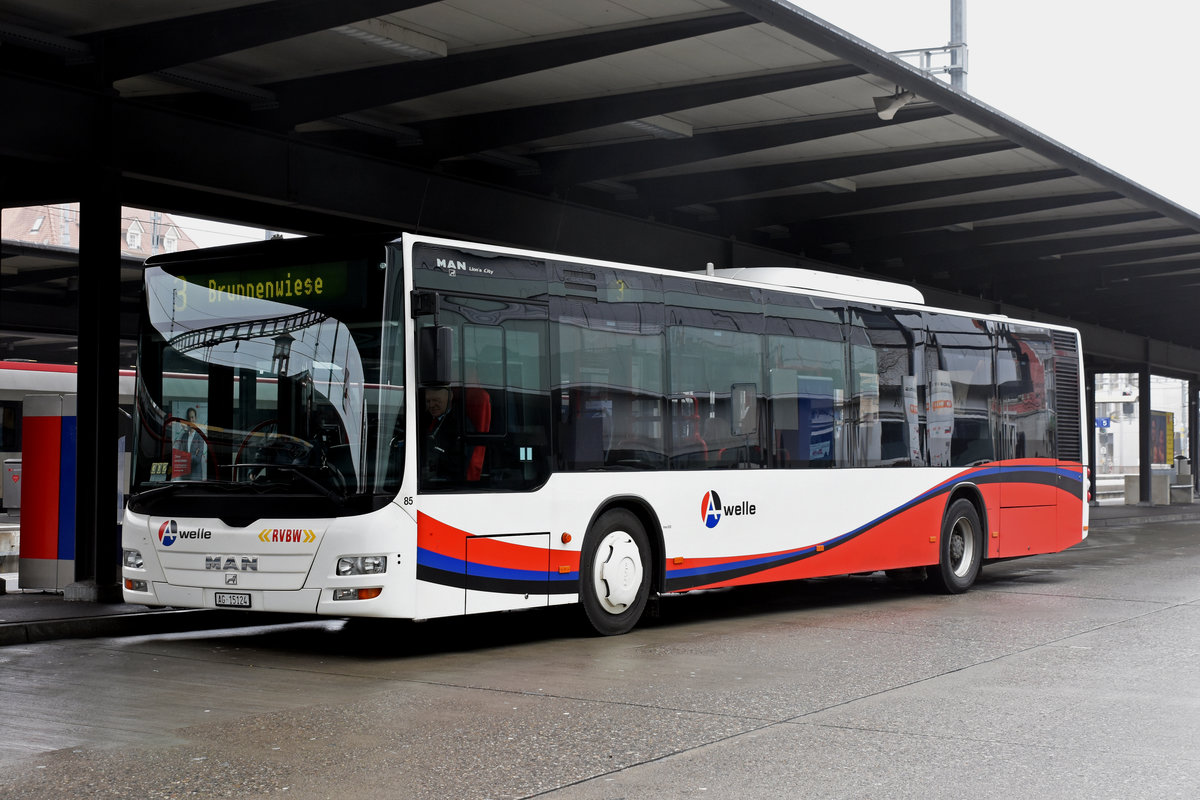 MAN Lions City 85 der RVBW, auf der Linie 3, bedient die Haltestelle beim Bahnhof Baden. Die Aufnahme stammt vom 02.02.2019.