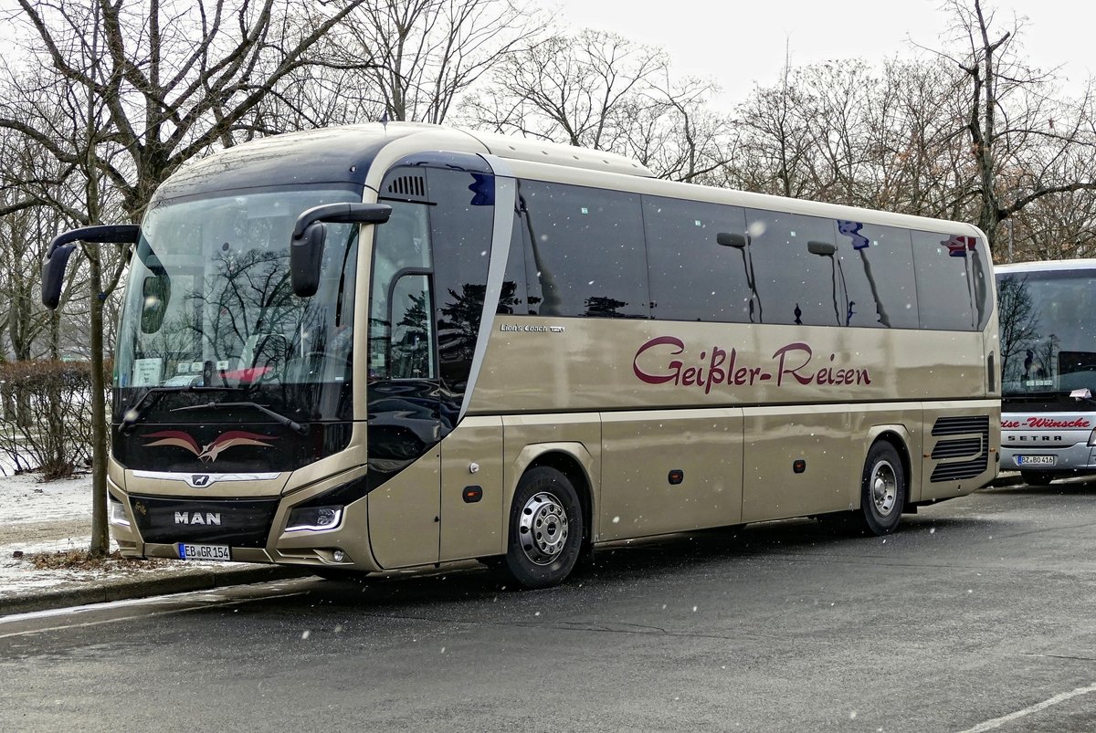 MAN Lion's Coach von ''Geißler -Reisen'', bei leichtem Schneefall in Berlin /Olympischer Platz im Januar 2019. (Grüne Woche, Messe)