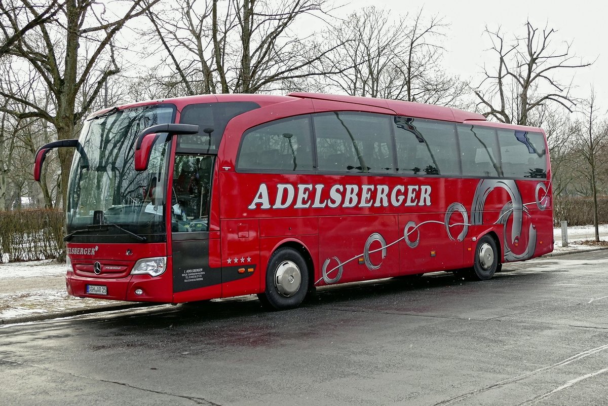 Mercedes -Benz Travego von ''Adelsberger'', bei leichtem Schneefall in Berlin /Olympischer Platz im Januar 2019. (Grüne Woche -Messe)