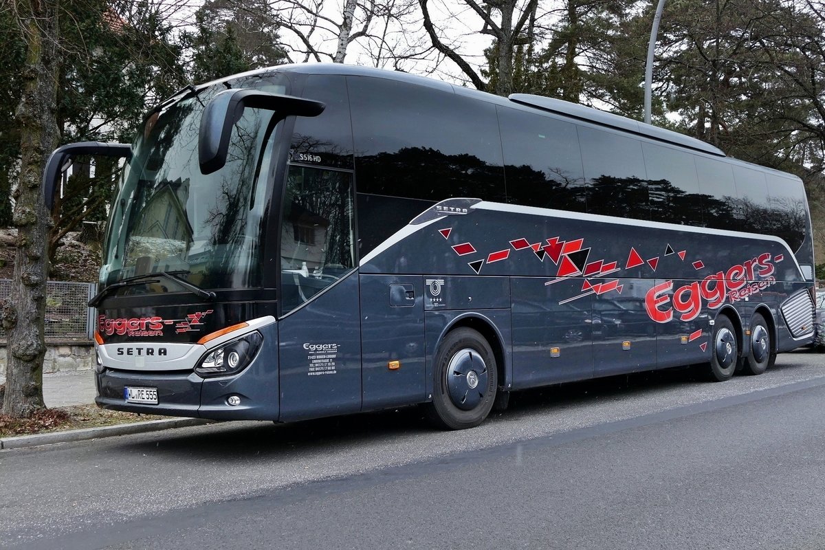 Setra S 516 HD von ''Egger's - Reisen'', bei leichtem Schneefall, nahe Olympiastadion (Südtor). Zur Grünen Woche in Berlin, Januar 2019. (Grüne Woche)