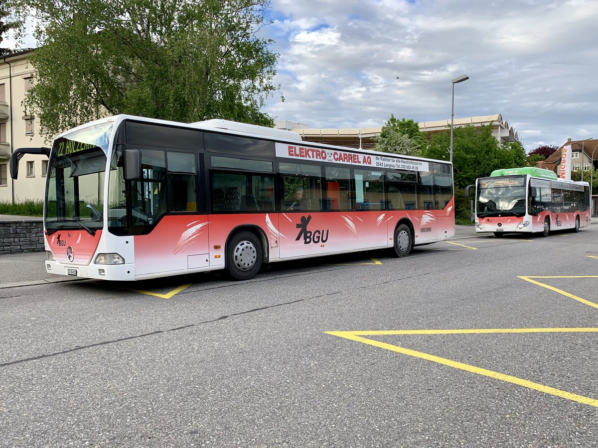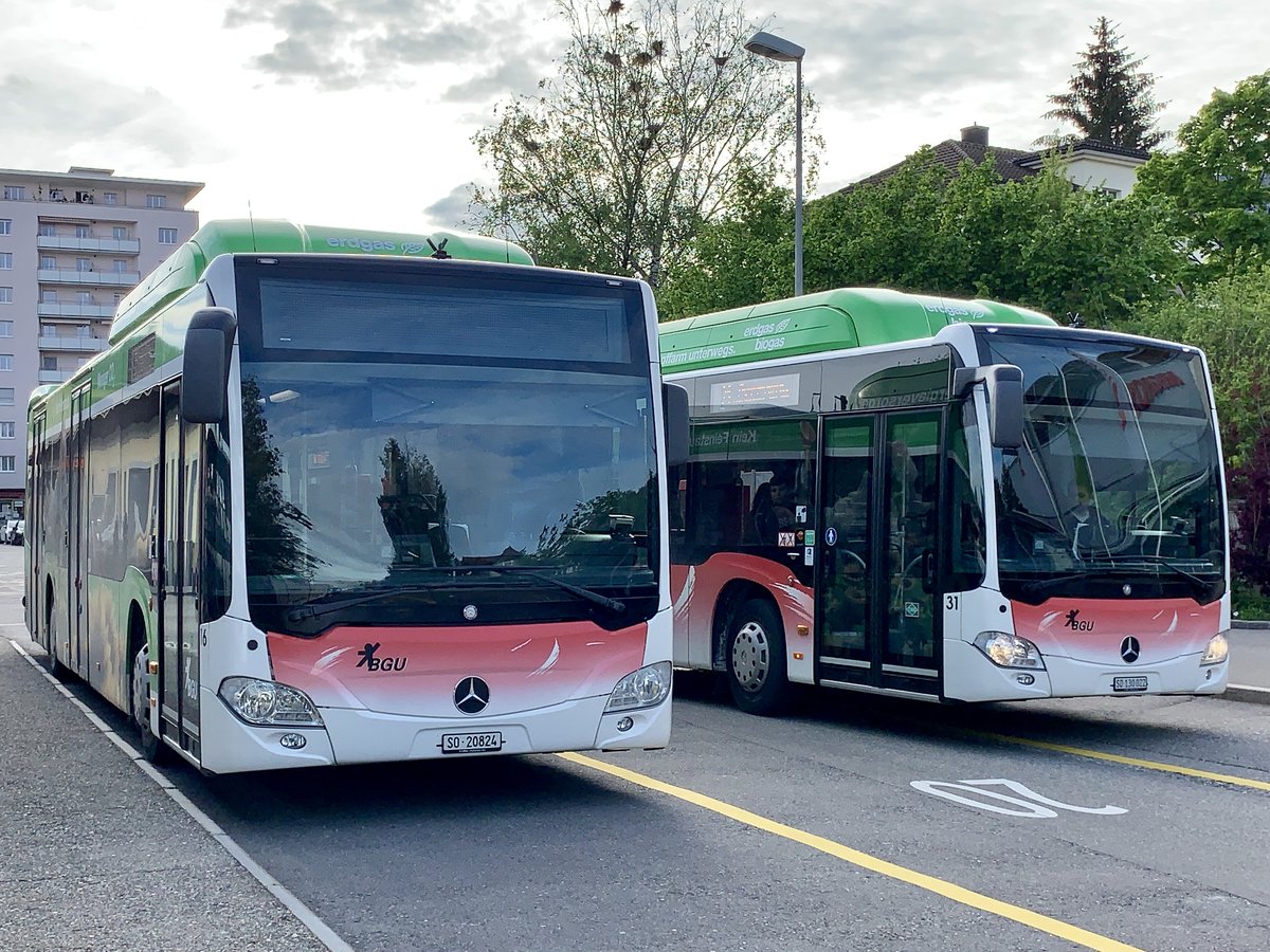 Der älteste Citaro Nr. 14 der BGU trifft einer der neusten C2 am 10.5.19 beim Bhf Grenchen Süd.