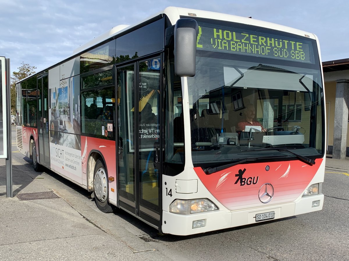 Der Citaro I Nr. 14 der BGU dreht immernoch fröhlich seine Runden, am 10.5.19 in Grenchen Süd.