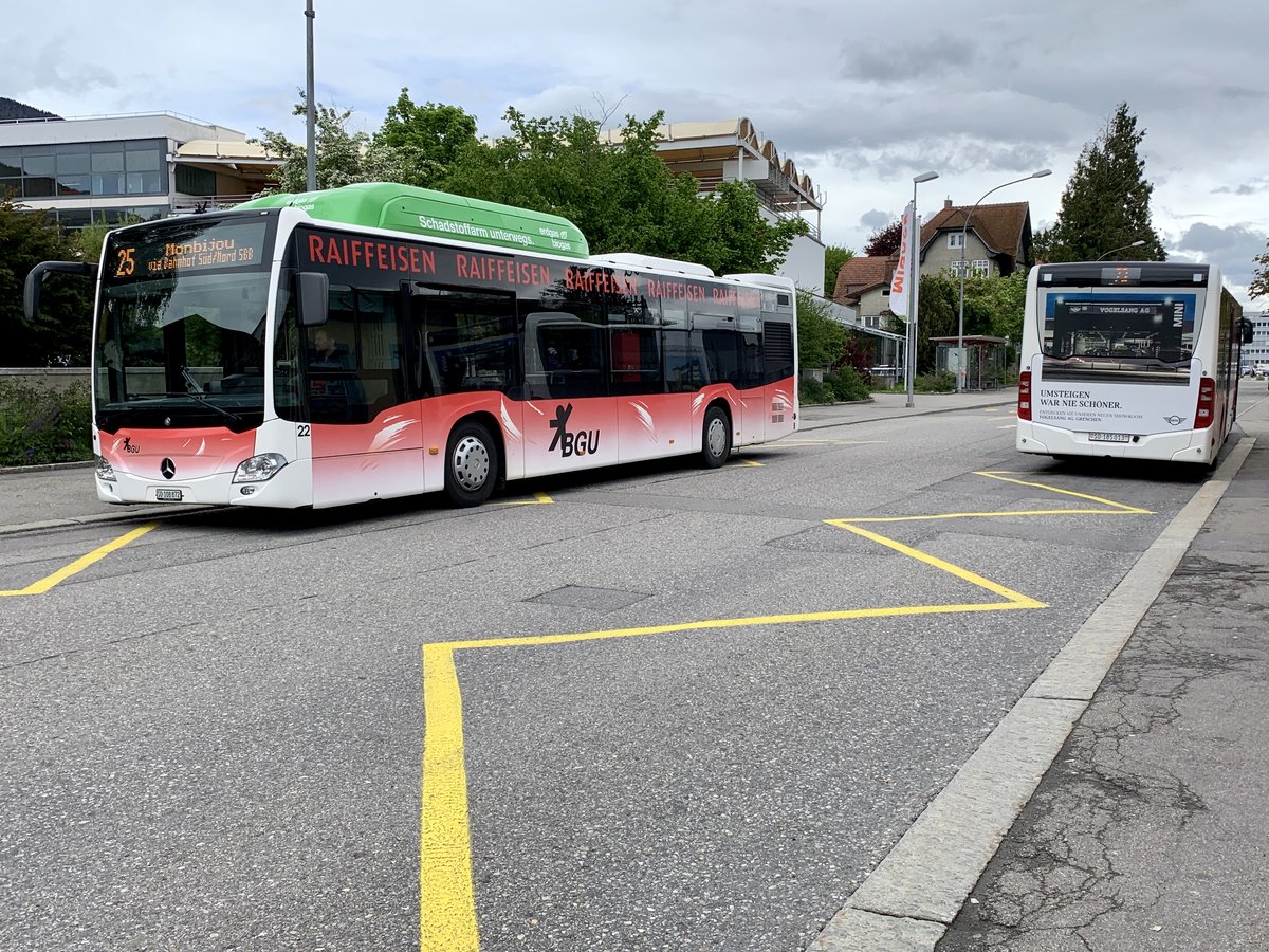 Der Citaro Facelift Nr. 25 mit Erdgas Werbung trifft am 10.5.19 den C2 NGT Nr. 16 der ebenfalls Erdgas Werbung trägt, beim Bhf Grenchen Süd.