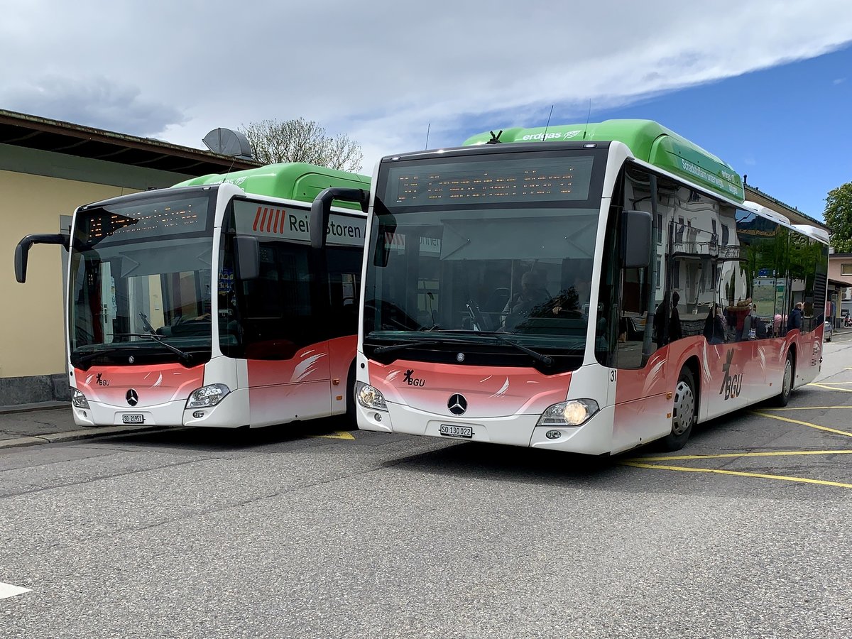 Beider Erdgas Werbebusse der BGU, Facelift Nr. 25 und C2 Nr. 16, treffen sich am 10.5.19 beim Bhf Grenchen Süd.