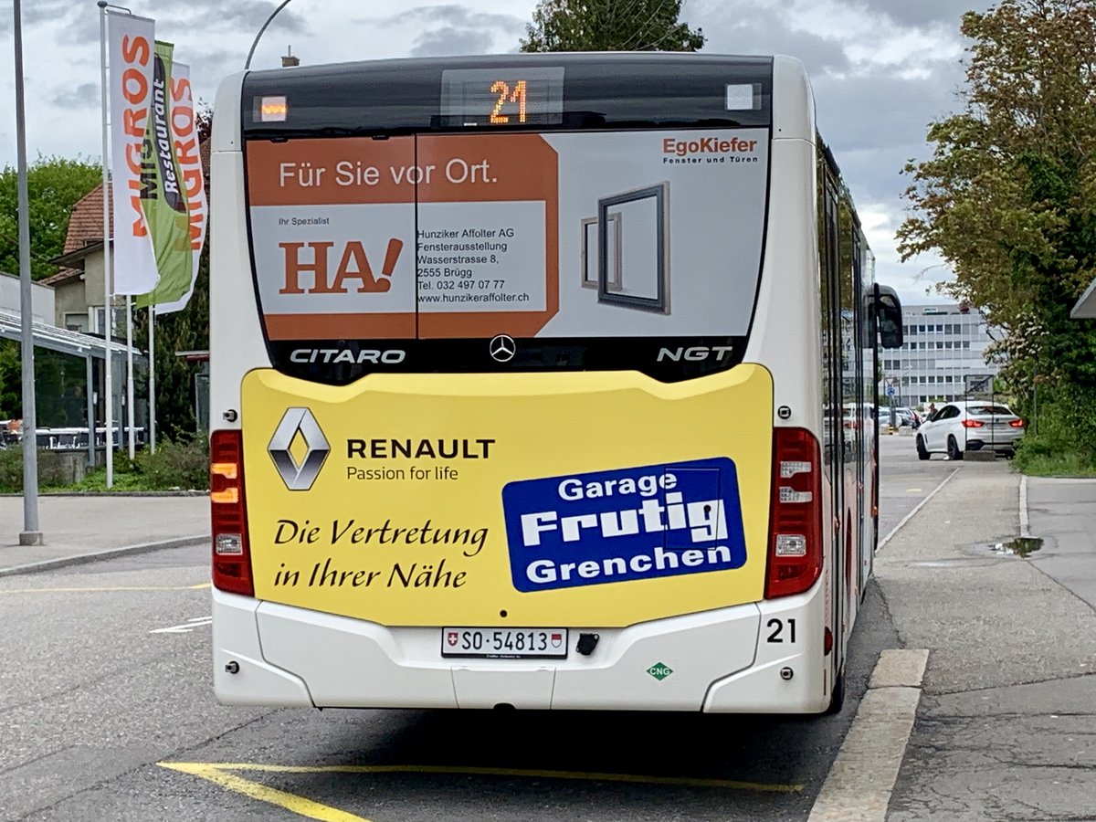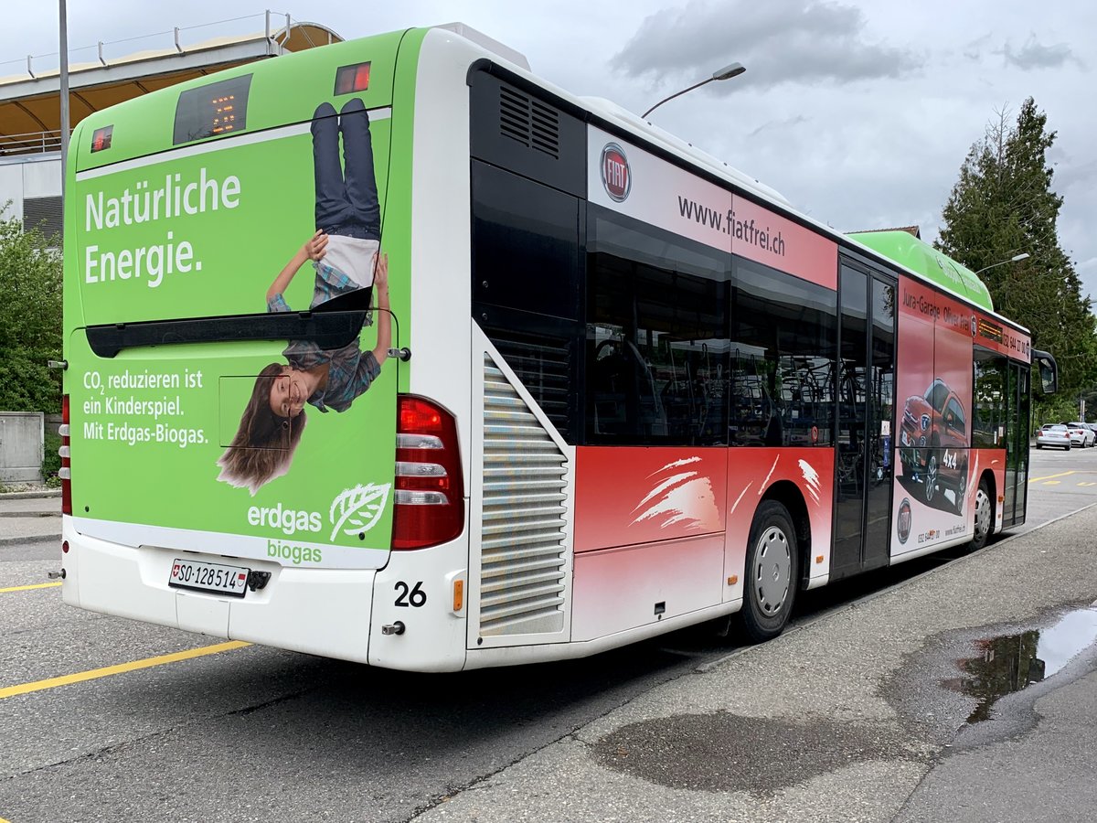 Heckansicht des MB C2 NGT Nr. 16 mit Erdgas Werbung am 10.5.19 beim Bhf Grenchen Süd.
