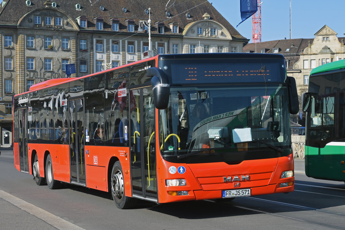 MAN Lions City von Südbadenbus, auf der Linie 38, überquert die Mittlere Rheinbrücke. Die Aufnahme stammt vom 28.03.2019.