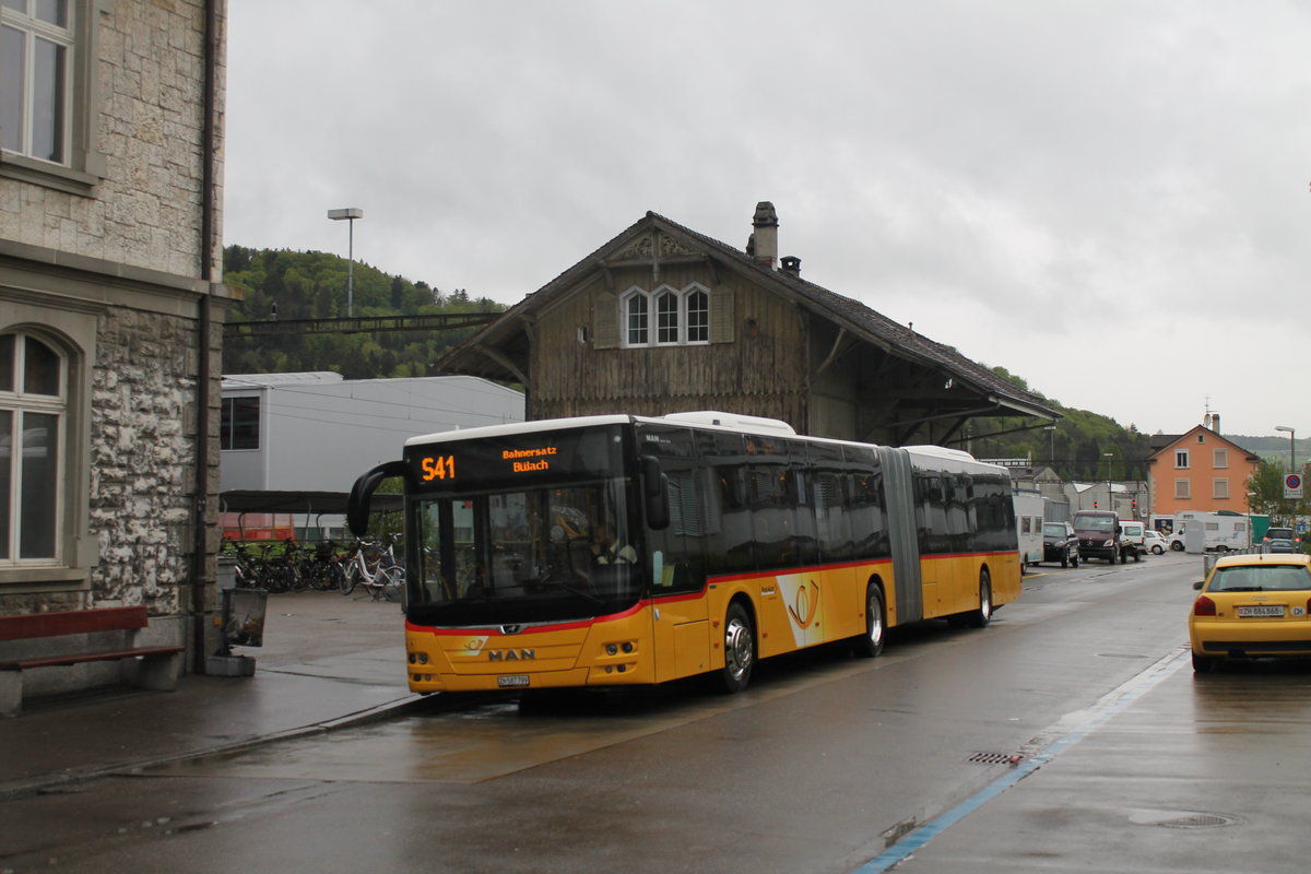 Postauto/Regie Zürcher Unterland Nr. 366 (MAN A23 Lion's City G) am 4.5.2019 beim Bhf. Wülflingen. Am Wochenende des 4. und 5. Mai 2019 war die Bahnlinie Winterthur - Bülach zwischen Wülflingen und Embrach infolge Bauarbeiten unterbrochen. 4 Postautos der Regie Zürcher Unterland waren für den Bahnersatz im Einsatz. Die Busse fuhren ab Wülflingen durchgehend bis Bülach, da sie Embrach zu spät für den Bahnanluss erreicht hätten.