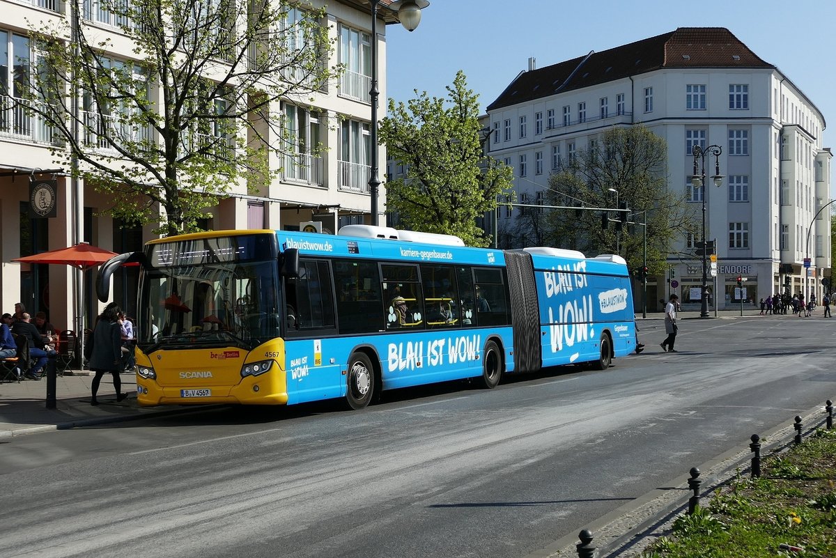 Scania Citywide der BVG, Wagen '4567' der Linie 109, /Richtung Flgh. Tegel, hier in Berlin- Charlottenburg im April 2019.