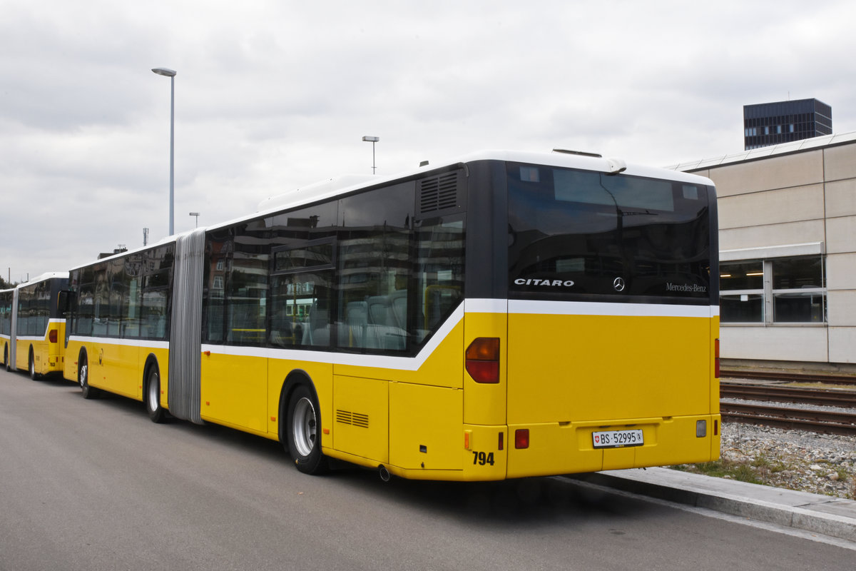 Für Tramersatz Dienste mieten die Basler Verkehrsbetriebe mehrere ältere Citaros. Der Mercedes Citaro 794 (ex PU ABSN Stadel Neerach) steht hinter dem Infrastruktur Gebäude am Strassenrand. Die Aufnahme stammt vom 05.04.2019.