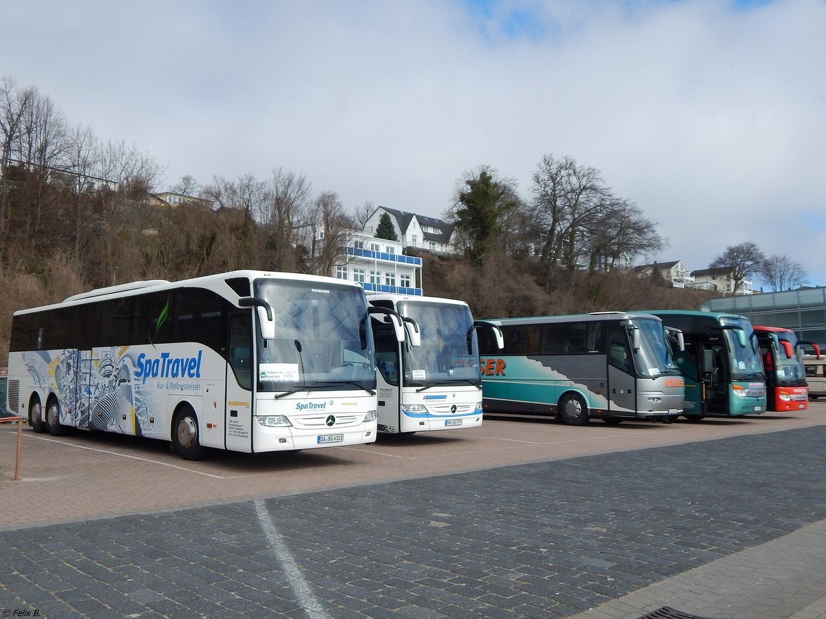 Mercedes Tourismo von Spa Travel GmbH und Mercedes Tourismo von Schmidt und VDL Bova Futura von Hülser und Setra 416 HDH von Numssen und Setra 415 GT-HD von Reisering Hamburg aus Deutschland im Stadthafen Sassnitz am 26.03.2016