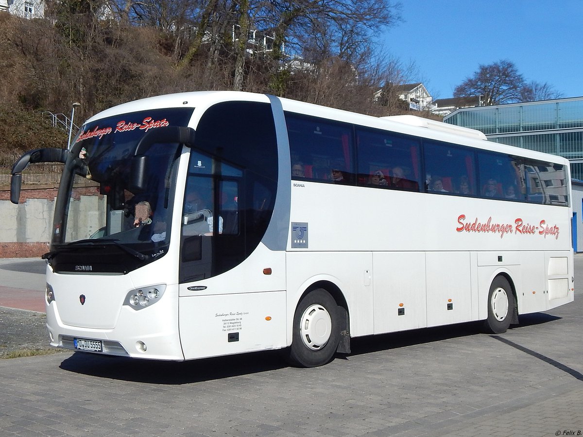 Scania OmniExpress von Sudenburger Reise-Spatz aus Deutschland im Stadthafen Sassnitz am 26.03.2016