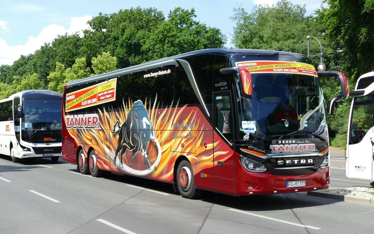Setra S 517 HDH, ''El Diabolo'' von Tanner KG, Omnibusvermietung & Reisebüro. Berlin im Juni 2020 zur Busdemo.