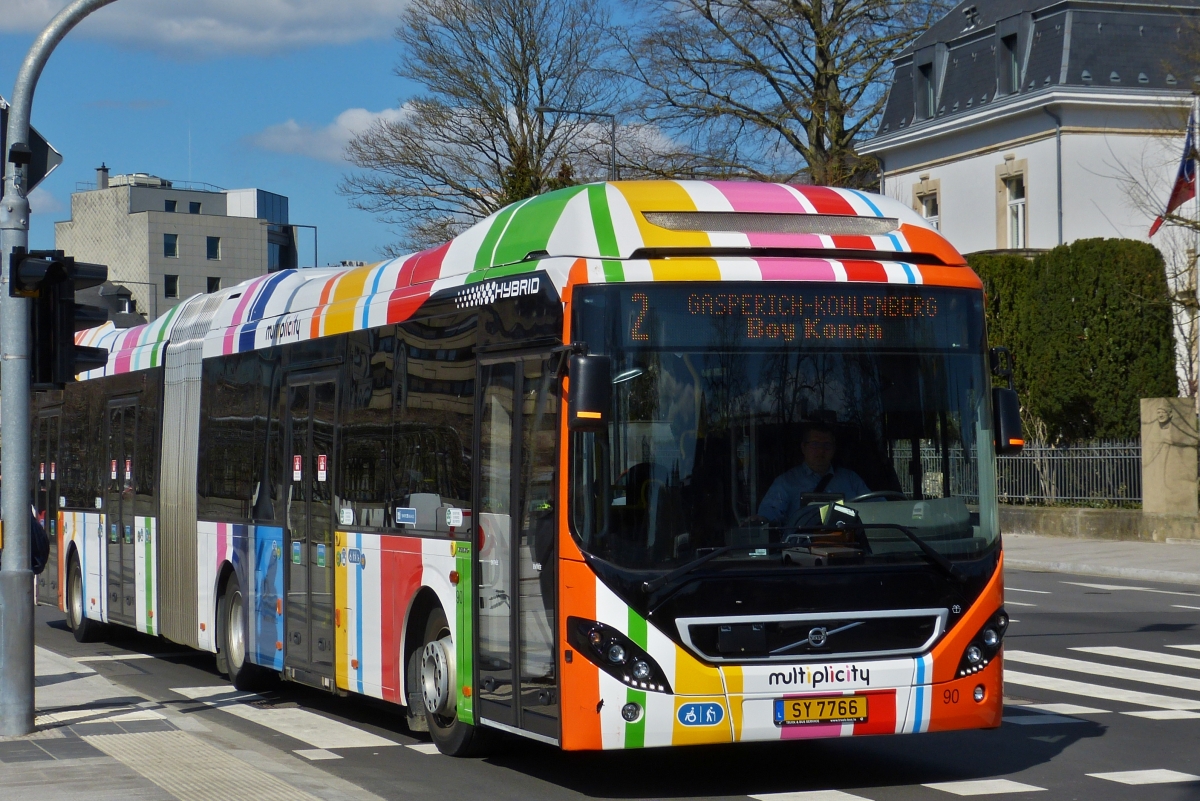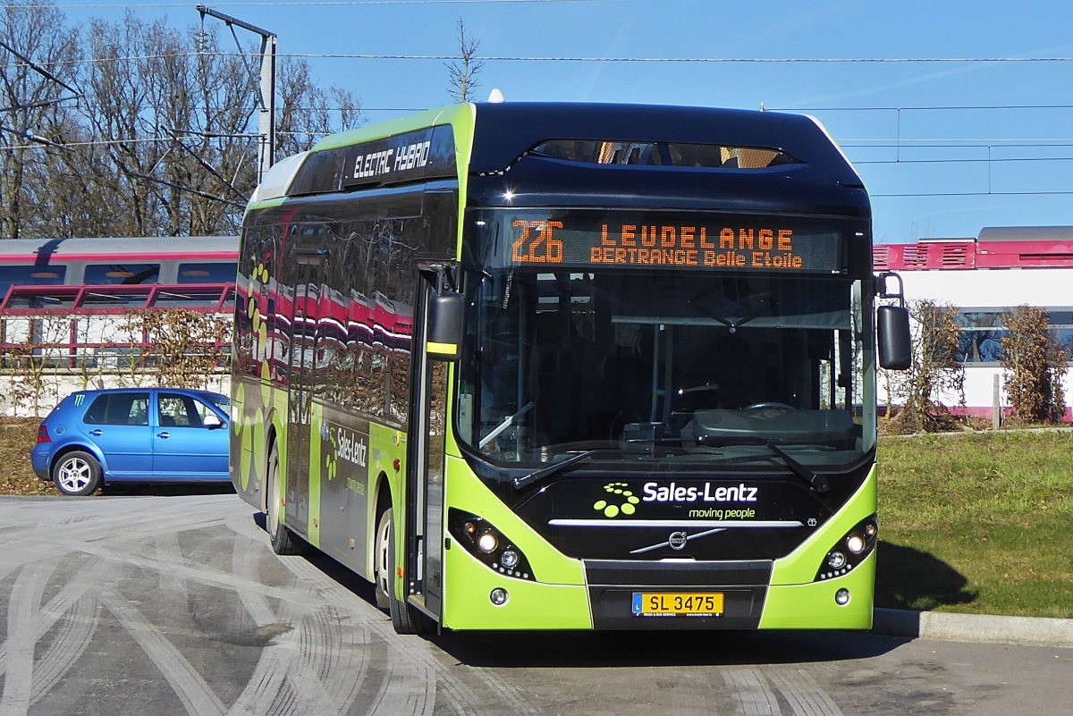 SL 3485, Volvo 7900 Hybrid Gelenkbus von Sales Lentz, aufgenommen in der Stadt Luxemburg. 05.04.2019