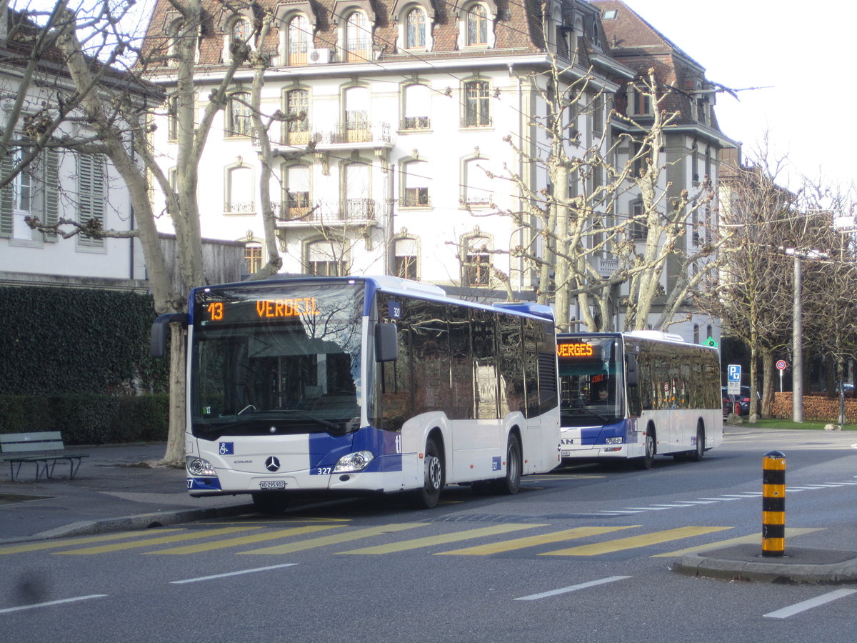 tl Nr. 327 (Mercedes Citaro C2 O530K) + Nr. 410 (MAN A21 Lion's City) am 23.2.2020 in Lausanne, Montbenon