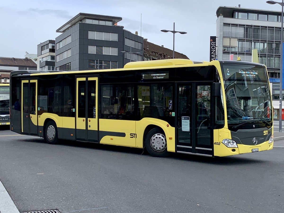 MB C2 402 der STI am 27.9.20 bei der Abfahrt beim Bahnhof Thun.