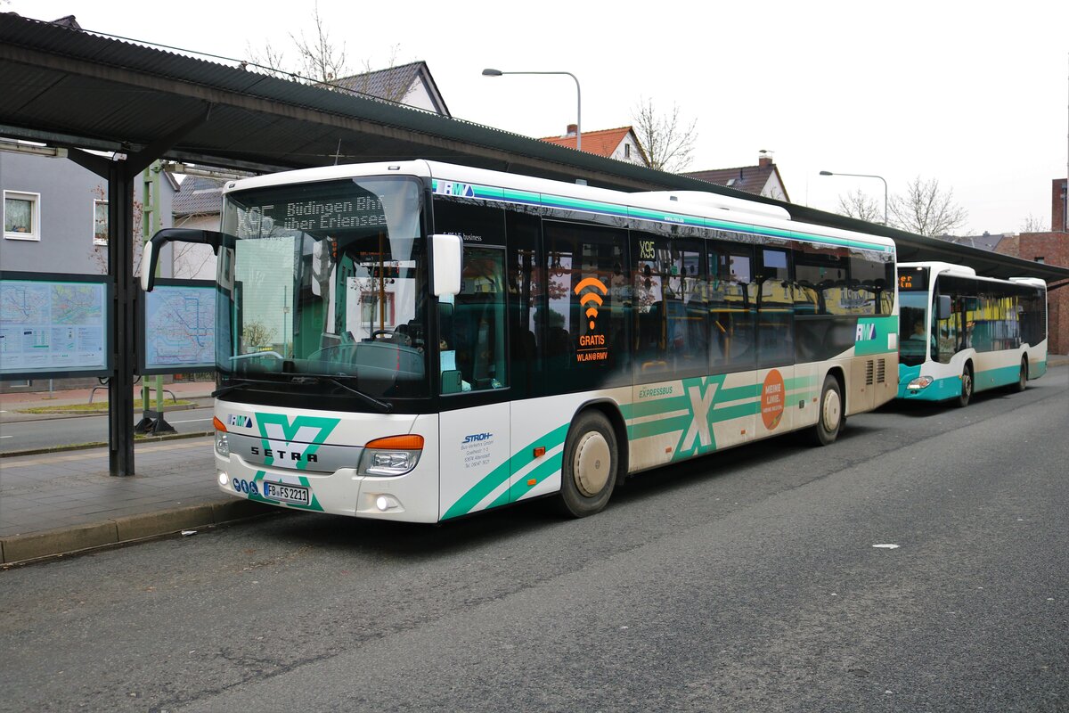Die neue RMV Schnellbuslinie X95 von Büdingen über Erlensee direkt nach Frankfurt Enkheim am 15.12.21 in Enkheim. Hier zu sehen Stroh Bus Setra Überlandbus