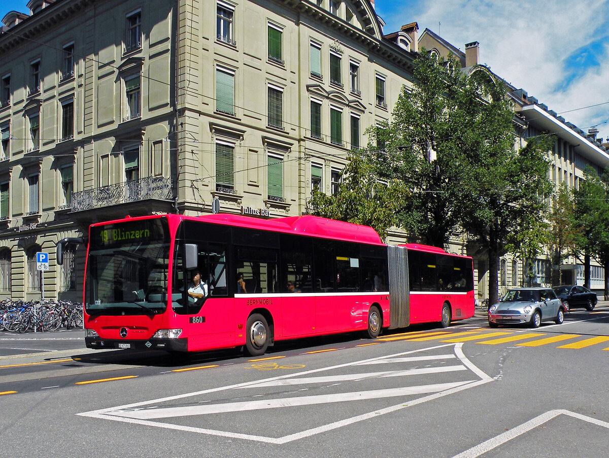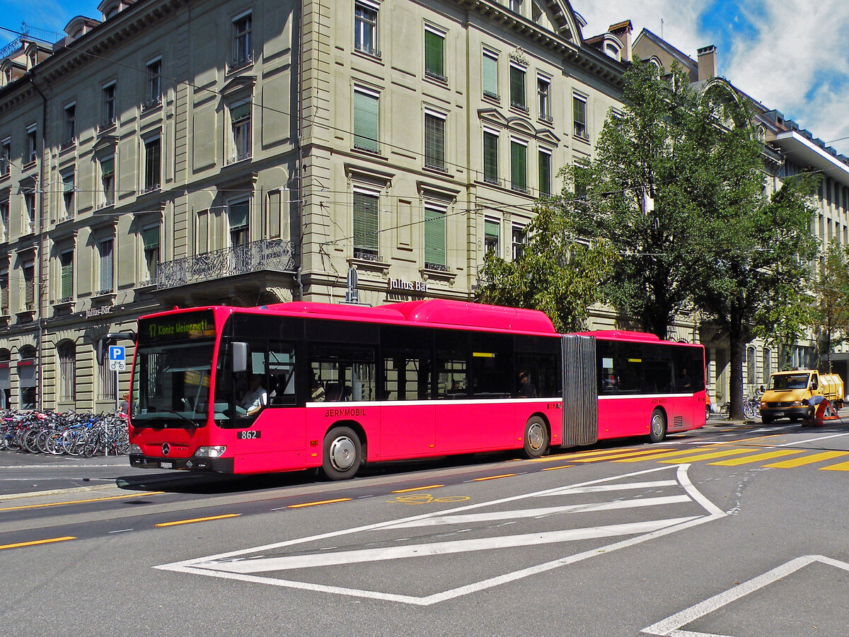 Mercedes Citaro 863, auf der Linie 12, überquert den Bubenbergplatz. Die Aufnahme stammt vom 26.08.2010.