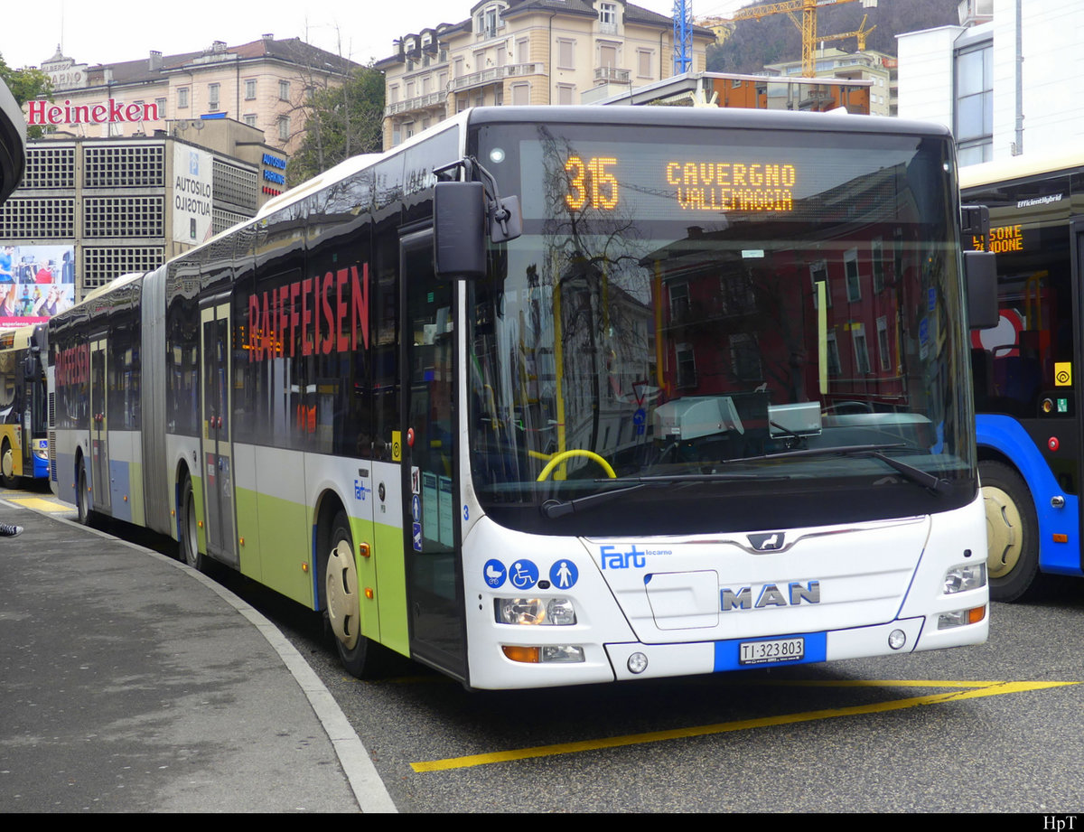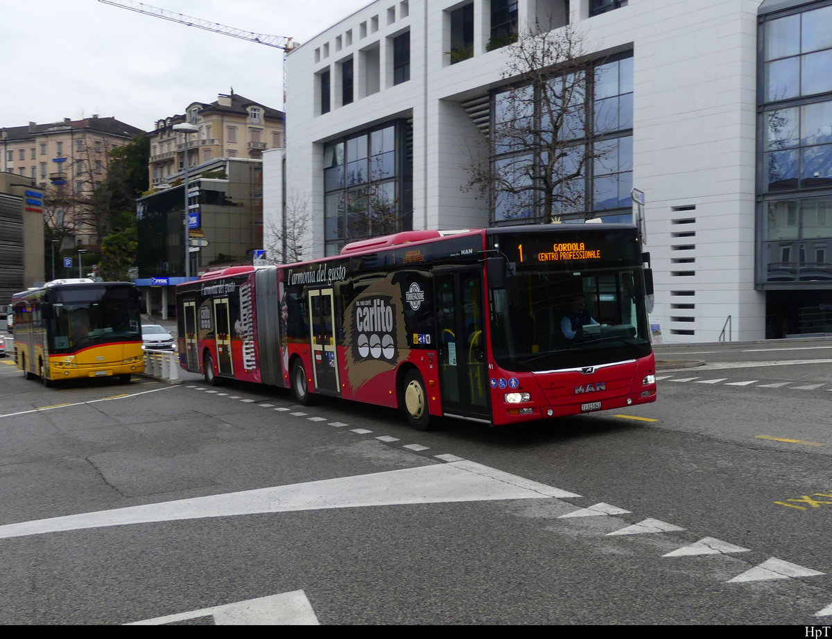 FART - MAN Lion`s City Nr.3 TI 323803 mit Werbung in Locarno vor dem Bahnhof bei den Bushaltestellen am 12.02.2021